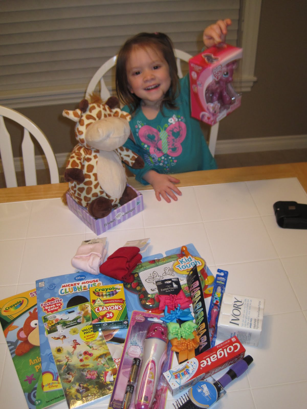 Our box all packed with toys, stickers, crayons, hygiene items, hair bows, socks, a flashlight, and of course LOVE! The stuffed animal didn't fit, but they found a place for him too. We also included a picture of us, a note, and a picture Addison drew.